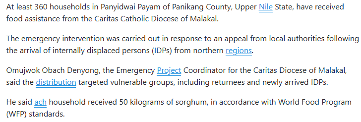 Malakal diocese provides food relief to struggling IDPs in Panyikang Countyby Sr. Elenaon Posted on May 30, 2025June 23, 2025 https://www.eyeradio.org/malakal-diocese-provides-food-relief-to-struggling-idps-in-panyikang-county/