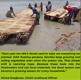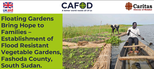 CAFOD is implementing the FCDO- funded South Sudan Humanitarian & Resilience Programme (SSHARP) – Transforming Household Resilience through Inclusive Economic Development (THRIVE) in Greater Upper Nile, South Sudan, as part of a consortium led by GOAL. In Fashoda, CAFOD and local implementing partner, Caritas Diocese of Malakal (CDoM) have introduced an innovative, climate-adaptive solution, called floating gardens. Built from locally available materials such as bamboo, water hyacinth, floating light woods and reeds, these gardens float on floodwater, providing a stable platform for vegetable production throughout the flood season. To strengthen community resilience, THRIVE mobilised residents across three target locations (payams) to establish flood-resistant vegetable gardens as an adaptive mechanism for continuous household food and income security during floods.