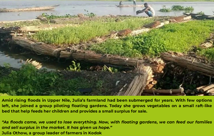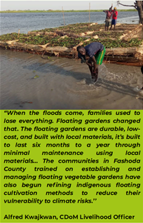The innovation has quickly gained traction. Inspired by early results, an additional 40 farmers self organised in groups in Dier Kodok Boma, Kodok Payam, approached THRIVE team in Fashoda for technical support and training, resulting inthem creating their own floating gardens. These groups are now growing tomatoes, onions, okra, kudra, and collards on floating plots, ensuring food at home and generating income from market sales. This scale-up reflects strong community ownership and sustainability as well as the positive influence of the initial floating gardens innovation.. Beyond nutrition and livelihoods, the gardens have a potential to showcase resilience, self-reliance, and hope. The project team continues to engage these trained farmers to expand, cascade, and replicate the approach across all Payams and Bomas of Fashoda County. This innovative, locally led practice demonstrates how adaptation to climate change can safeguard livelihoods, reduce reliance on humanitarian aid, and enable communities to chart a sustainable path toward resilience in one of South Sudan’s most flood-affected regions. With FCDO support catalyzing both piloting and replication, scaling up will amplify nutrition, income, and dignity across more households. Realizing this potential will require increased funding, stronger collaboration, and sustained commitment from all stakeholders.